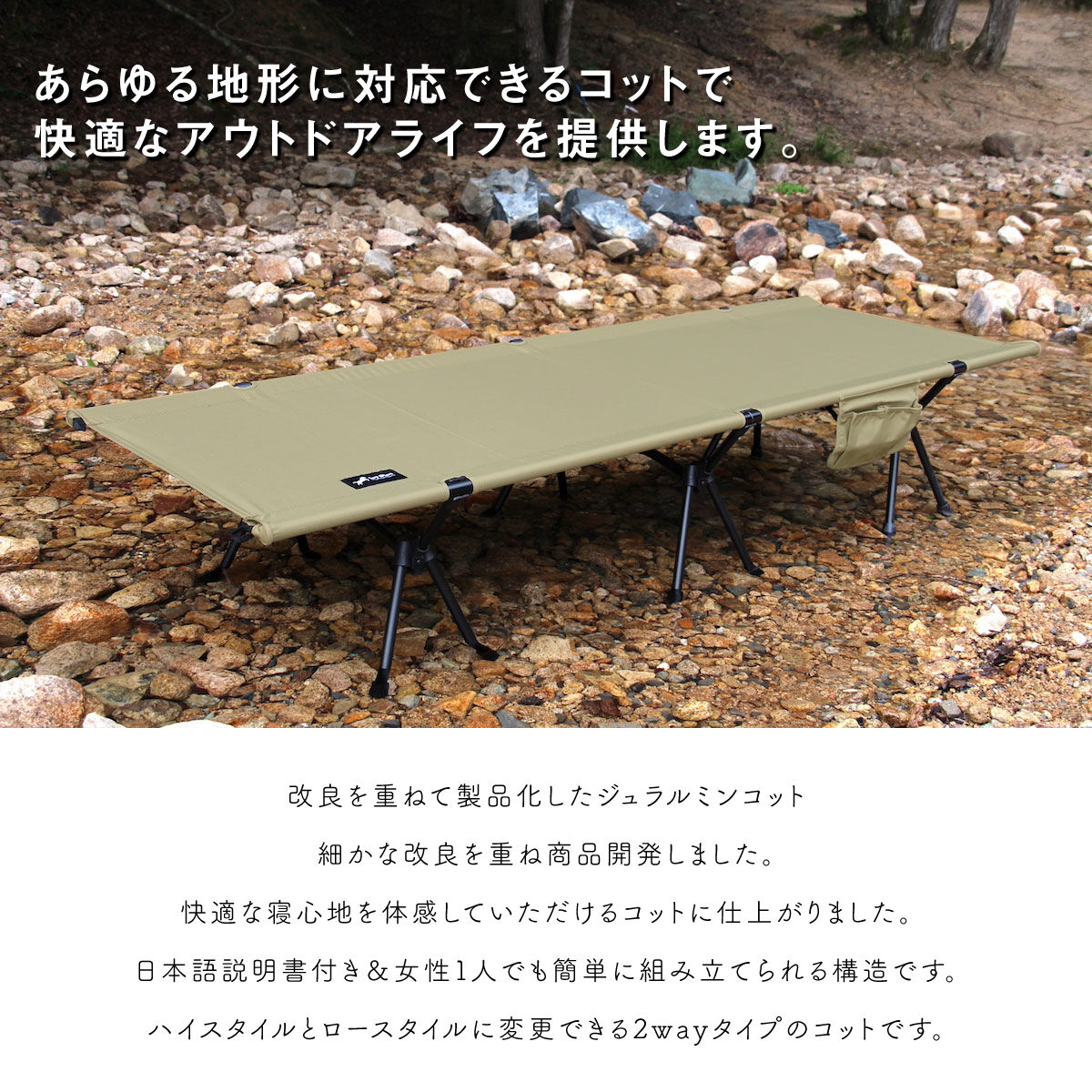 | 商品の特徴 | 未使用品・定価の30%オフ】2way ジュラルミン コット。未使用品・定価の30%オフ】2way ジュラルミン コット。未使用品・定価の30%オフ】2way ジュラルミン コット。ご覧頂きありがとうございます!キャンプで大活躍のコット、送料込みです!これからのキャンプシーズンにどうぞ!■商品名2way ジュラルミン コット No.415(定価¥15,840)■色サンドベージュ■仕様コットサイズ:HIGH STYLE 約190x65x38cm、LOW STYLE 約190x65x17cm収納袋サイズ約:約53xφ18cm材質:コットシート 600Dオックスフォード フレーム:A7075超々ジュラルミン重さ:3.2kg(フットフレーム含む)耐荷重:150 kg※2023.05.25購入※一度、屋内で試しに組み立てましたが、実際には屋外で使っておりませんので、未使用に近い、としています。。未使用品・定価の30%オフ】2way ジュラルミン コット | ||