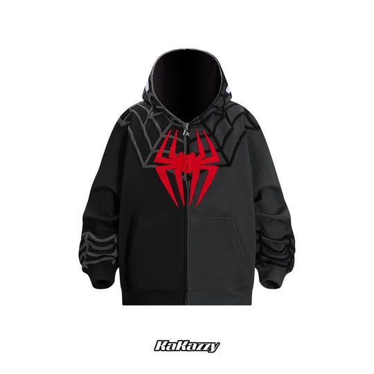 SPIDERMAN スパイダーマン/フルジップ 長袖フリース(ブラック)/刺繍 KaKazzy】スパイダーマン ブラック フルジップ パーカー 男女着用可